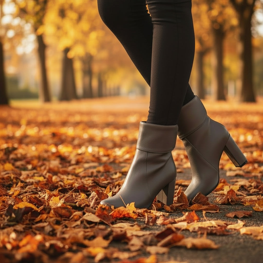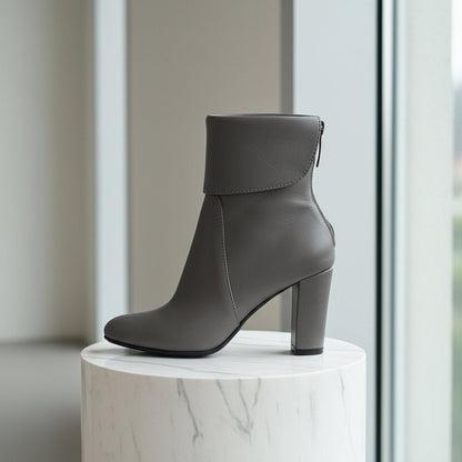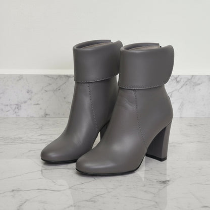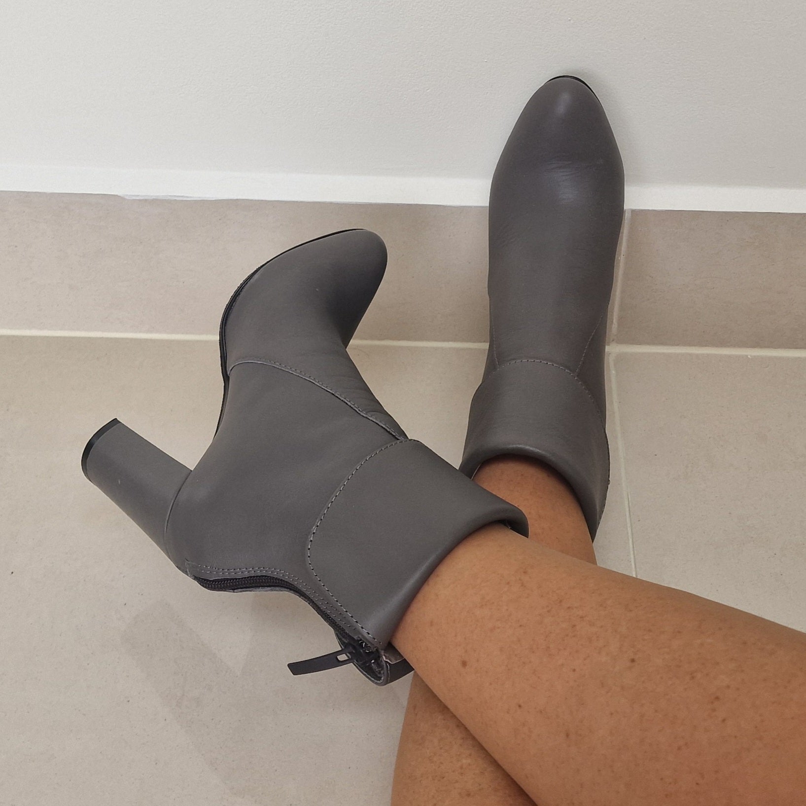 Soft grey leather calf boots with fold-over panelling, 8cm block heel, zip fastening, and leather insole for petite feet