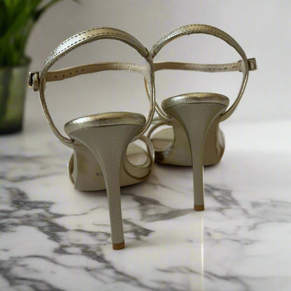 The IZZY sandals in gold leather are the perfect blend of elegance and comfort for petite feet. Featuring a delicate 10cm stiletto heel supported by a small platform, these sandals offer height without compromising stability. The leather cushioned sole ensures comfortable wear, while the removable front bow adds a versatile touch to your styling options. Crafted for those who love refined sophistication, IZZY sandals elevate any look effortlessly.