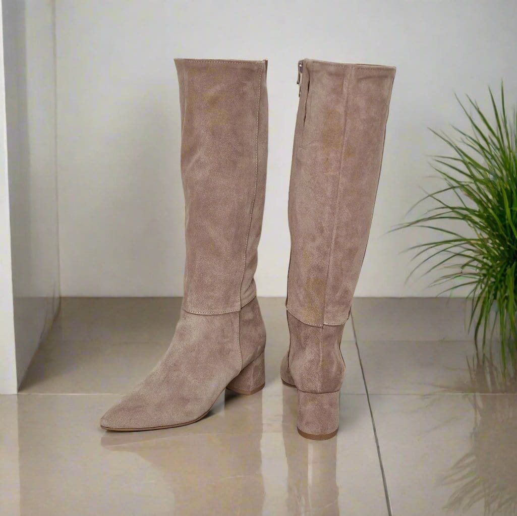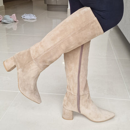 Meet WINTER, our petite-friendly knee boots designed for small feet. Available in black or beige suede, they refine outfits with a sleek pointed toe and a leg-lengthening 6cm block heel. A soft leather inner cushions every step and the elasticated top gives a flexible, secure fit from commute to dinner.