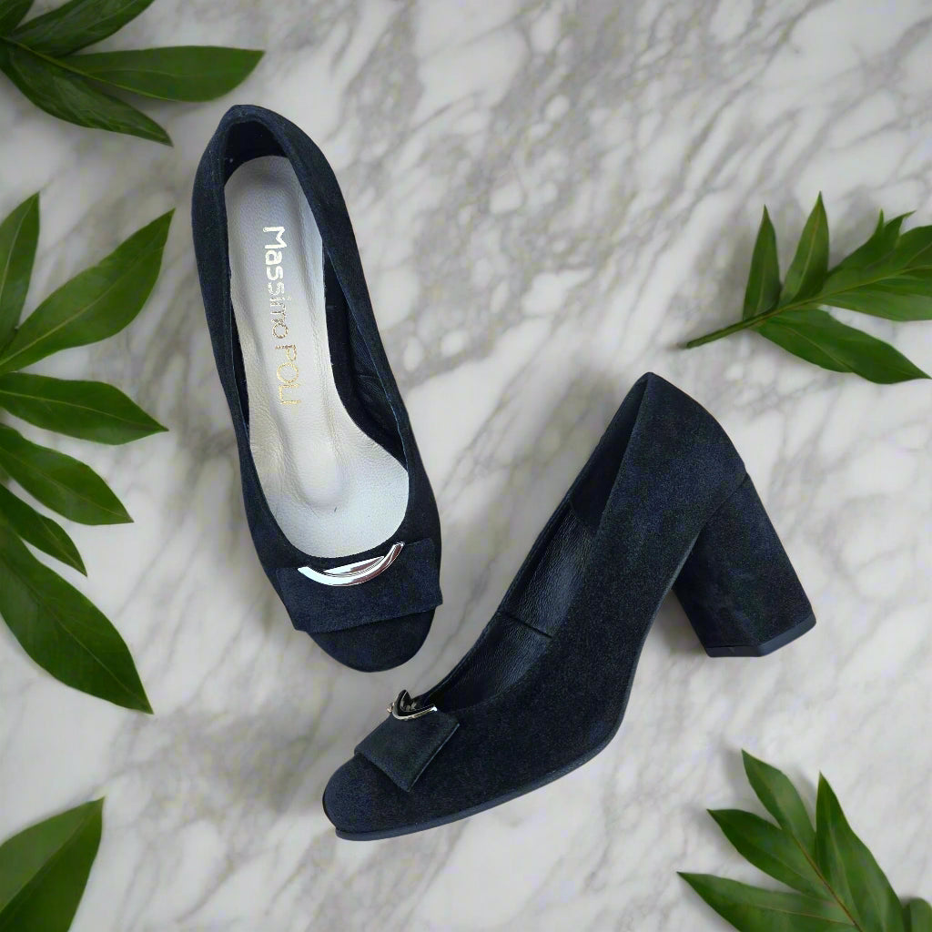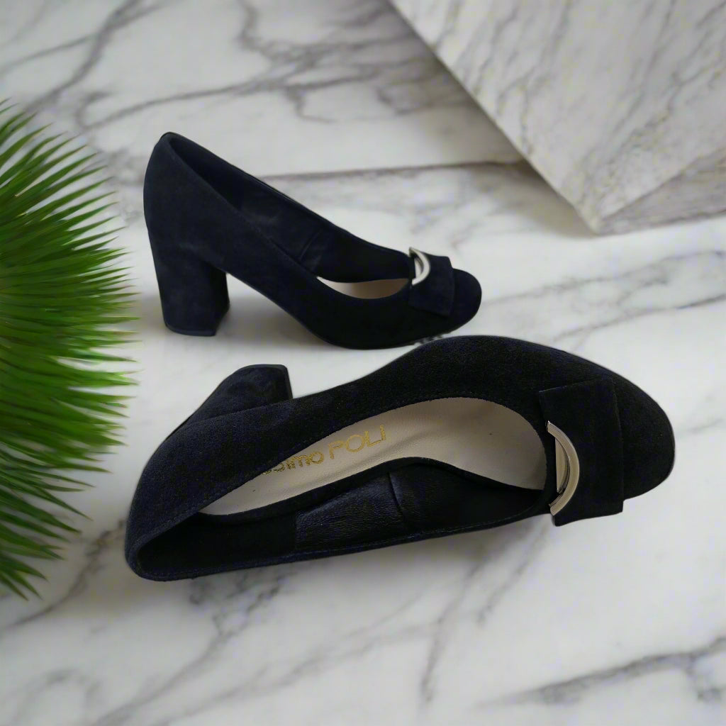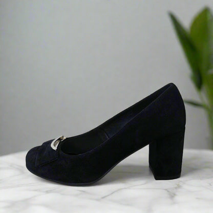 The IMOGENE court heels combine classic elegance with modern comfort. Available in black suede or smooth calf leather, these shoes feature a comfortable 7cm block heel and an almond toe shape for a flattering fit on petite feet. The leather insole adds cushioned support, while subtle silver detailing enhances the sophisticated design. IMOGENE heels are perfect for professional and formal settings, offering both style and stability.