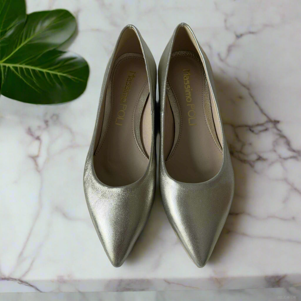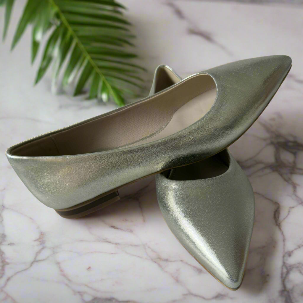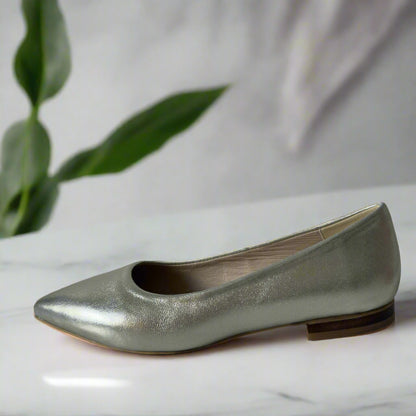 Side and top flat lay of petite small size gold leather ballerinas with pointed toes.