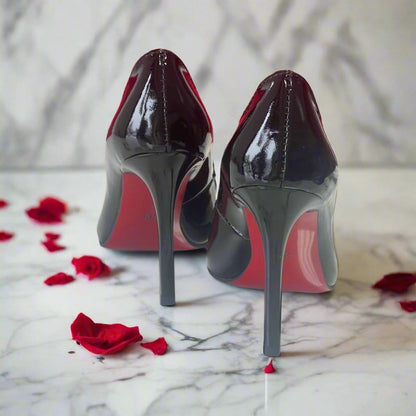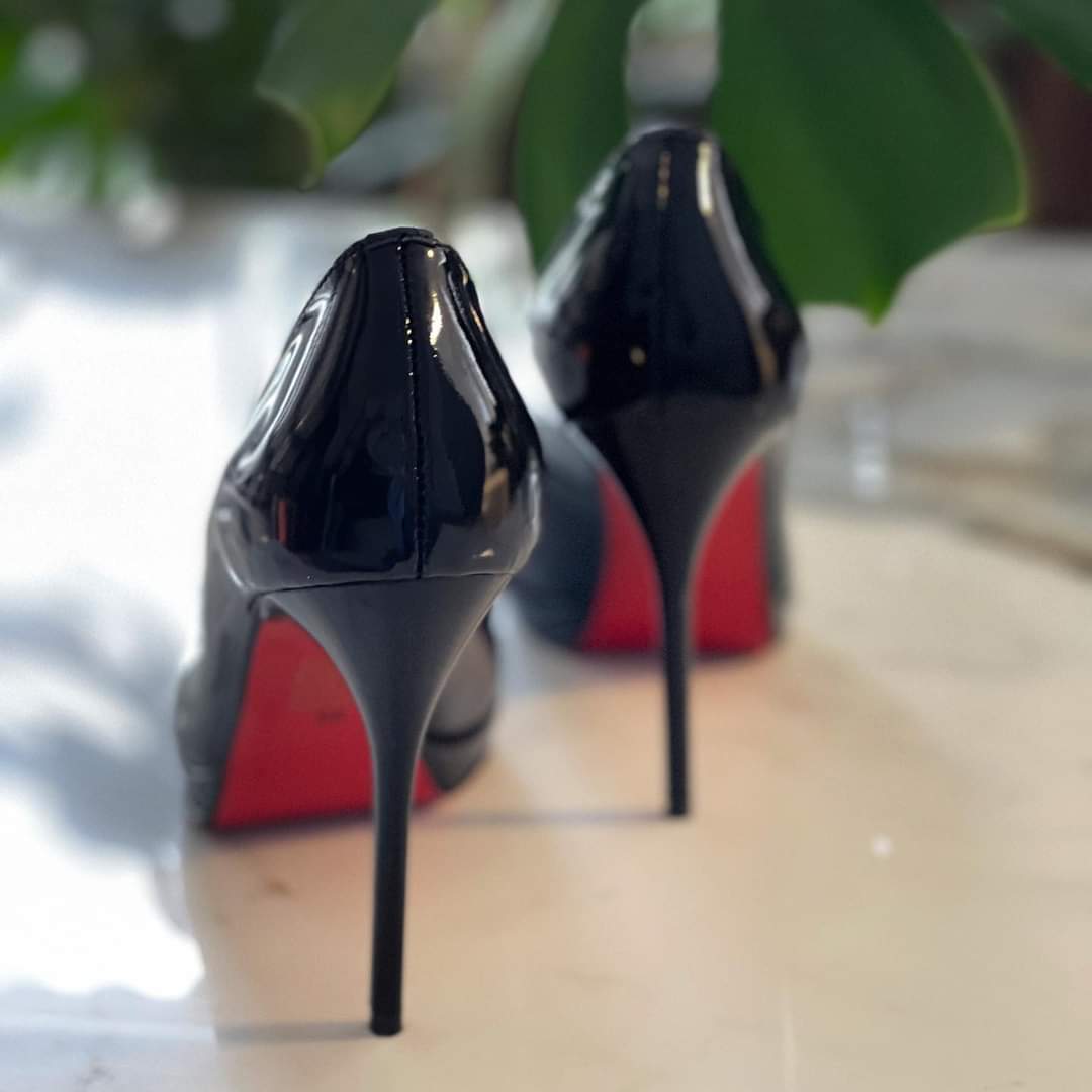Estos tacones de aguja no necesitan presentación. Da rienda suelta a tu descaro interior con charol negro de alto brillo y suela roja sexy. Punta puntiaguda, tacón de aguja de 9 cm y un seductor corte al tobillo hacen que estos pequeños zapatos de salón llamen la atención.