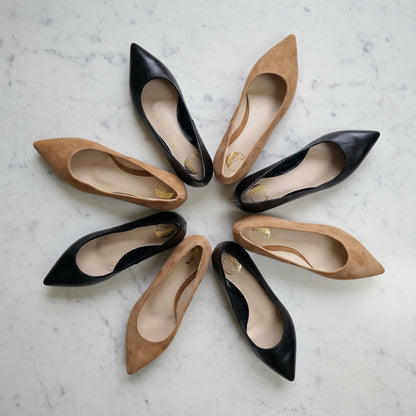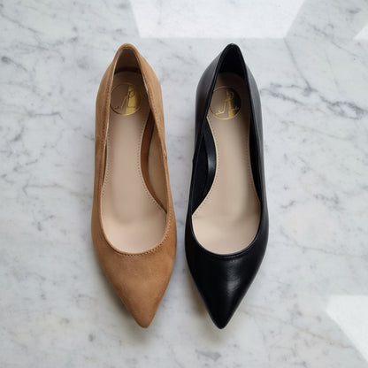 Experience understated luxury with the ZEA ballerina pumps, designed exclusively for petite feet. Available in rich brown suede or sleek black smooth leather, these pumps feature a classy pointed toe and a subtle 2cm wooden heel that offers comfort without compromising style. Handmade with care, each pair is equipped with a leather cushioned insole to ensure lasting comfort throughout your day. Perfect for elevating both casual and formal outfits, ZEA pumps blend timeless elegance with premium quality materials.